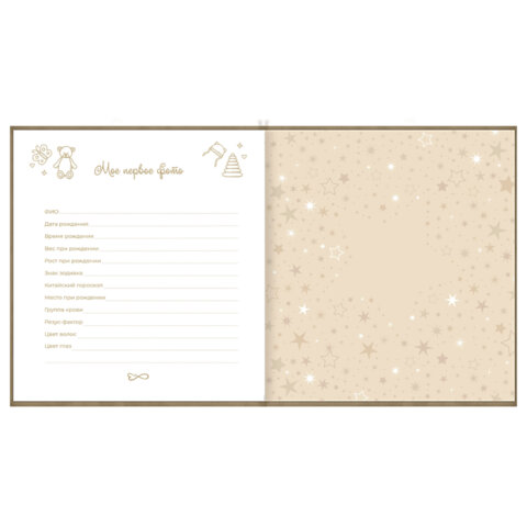 Фотоальбом-анкета детский 23х25 см, 32 листа, стикеры, открытка, конверт, бежевый бархат, BRAUBERG, 391421