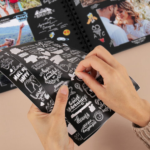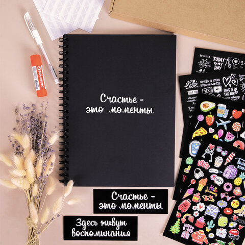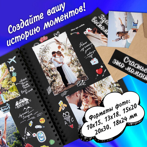Фотоальбом "Счастье – это моменты" 24 чёрных листа 22x30, уголки, стикеры, ручка, клей, BRAUBERG, 391310