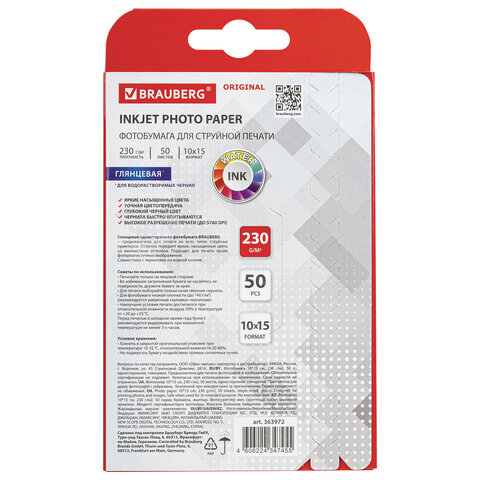 Фотобумага глянцевая, 10х15 см, 230 г/м2, односторонняя, 50 листов, BRAUBERG ORIGINAL, 363972