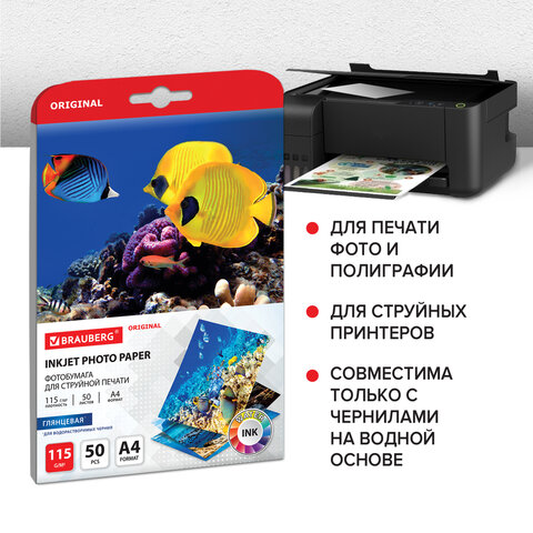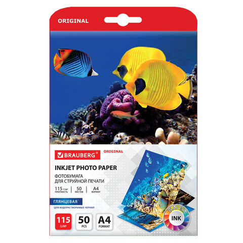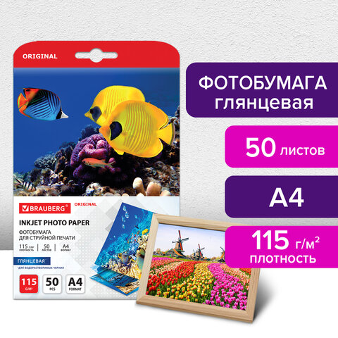Фотобумага глянцевая, А4, 115 г/м2, односторонняя, 50 листов, BRAUBERG ORIGINAL, 363980
