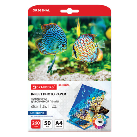 Фотобумага глянцевая, А4, 260 г/м2, односторонняя, 50 листов, BRAUBERG ORIGINAL, 363992