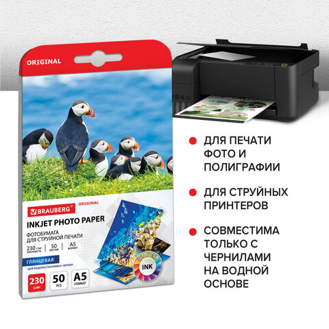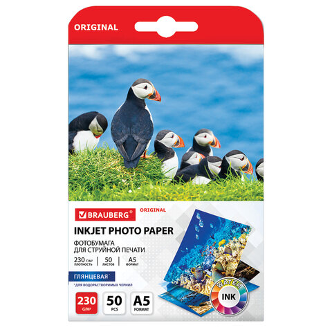 Фотобумага глянцевая, А5, 230 г/м2, односторонняя, 50 листов, BRAUBERG ORIGINAL, 363977