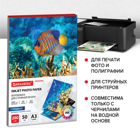Фотобумага глянцевая БОЛЬШОГО ФОРМАТА, А3, 200 г/м2, односторонняя, 50 листов, BRAUBERG ORIGINAL, 363995