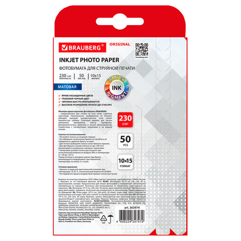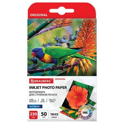 Фотобумага матовая, 10х15 см, 230 г/м2, односторонняя, 50 листов, BRAUBERG ORIGINAL, 363974