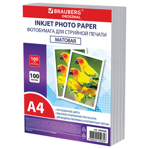 Фотобумага матовая, А4, 160 г/м2, односторонняя, 100 листов, ПАКЕТ, BRAUBERG ORIGINAL, 364428