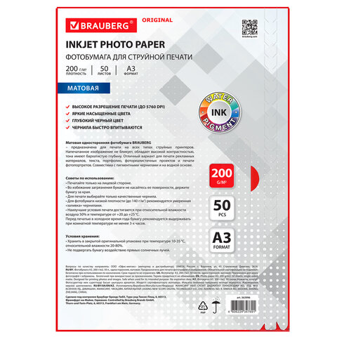 Фотобумага матовая БОЛЬШОГО ФОРМАТА, А3, 200 г/м2, односторонняя, 50 листов, BRAUBERG ORIGINAL, 363996
