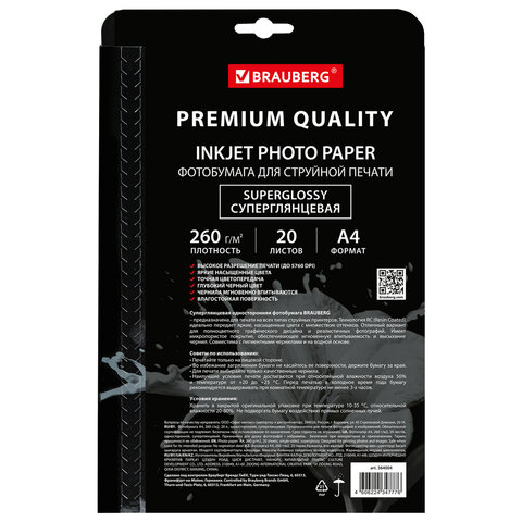 Фотобумага PREMIUM суперглянцевая, А4, 260 г/м2, односторонняя, 20 листов, BRAUBERG, 364004