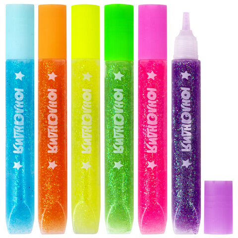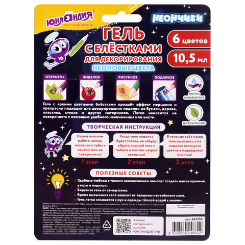 Гель с блестками ЮНЛАНДИЯ "НЕОНЧИКИ", для декора, поделок, DIY, творчества, оформления, 6 цветов по 10,5 мл, блистер, 662250