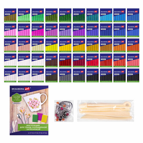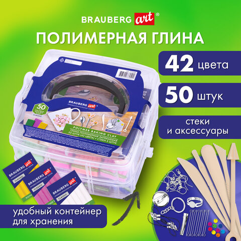 Глина полимерная запекаемая, НАБОР 50 штук (42 цвета) по 20 г, с аксессуарами в кейсе, BRAUBERG ART, 271166