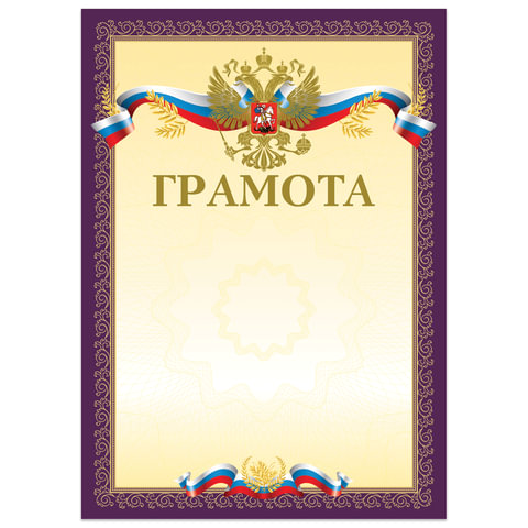 Грамота А4, мелованный картон, конгрев, тиснение фольгой, пурпурная, BRAUBERG, 126547