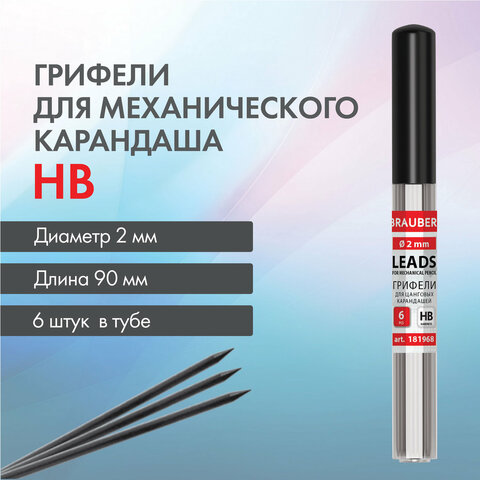 Грифели для цангового карандаша 2 мм, HB, КОМПЛЕКТ 6 шт., в тубе, BRAUBERG, 181968