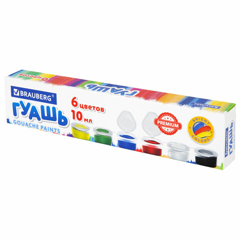 Гуашь BRAUBERG "PREMIUM", 6 цветов по 10 мл, 191906