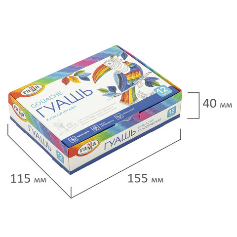 Гуашь ГАММА "Классическая", 12 цветов по 20 мл, картонная упаковка, 22103012
