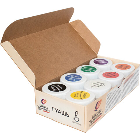 Гуашь серии "Школа творчества" изготовлена по улучшенной рецептуре. Благодаря этому цвета краски, не теряя своей яркости и красоты, стали максимально подготовлены для быстрого рисования. Гуашь имеет отличную укрывистость, легко смывается с рук и одежды.