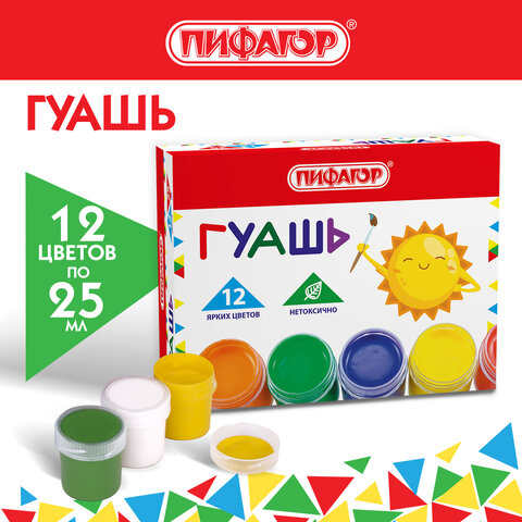 Гуашь ПИФАГОР "СОЛНЫШКО", 12 цветов по 25 мл, 192646