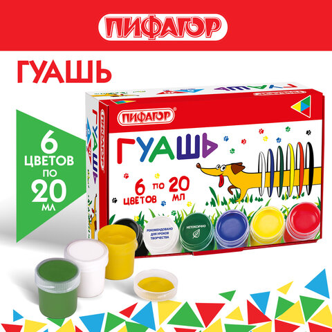 Гуашь ПИФАГОР "ВЕСЕЛАЯ ТАКСА", 6 цветов по 20 мл, 192378