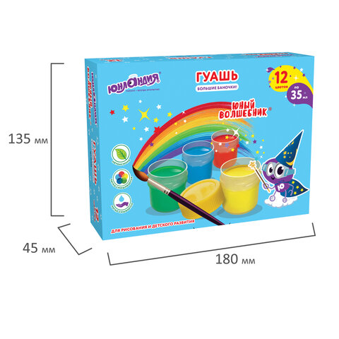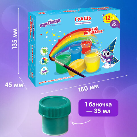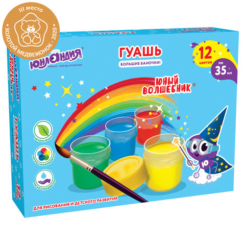 Гуашь ЮНЛАНДИЯ "ЮНЫЙ ВОЛШЕБНИК", 12 цветов по 35 мл, БОЛЬШИЕ БАНОЧКИ, высшее качество, 191336