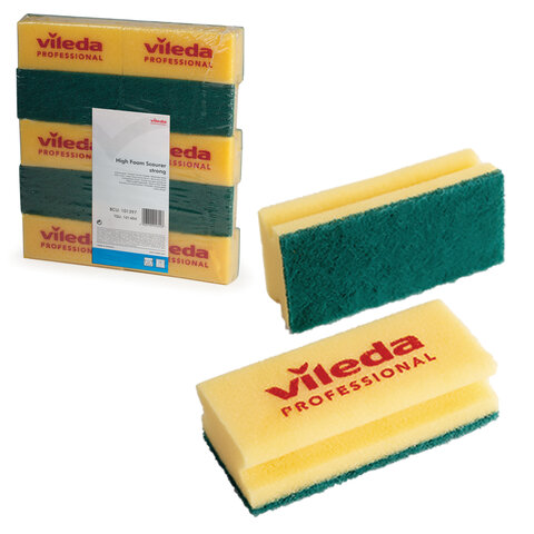 Губки хозяйственные 15х7х4,5 см, КОМПЛЕКТ 10 шт., для любых поверхностей, желтые, зеленый абразив, VILEDA, 101397