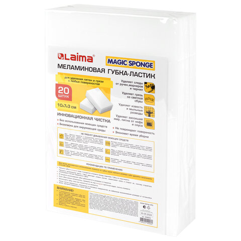 Губка-ластик МЕЛАМИНОВАЯ для удаления пятен, для чистки кухни, уборки, обуви, 10х7х3 см, КОМПЛЕКТ 20 шт., полибэг, LAIMA, 608955.