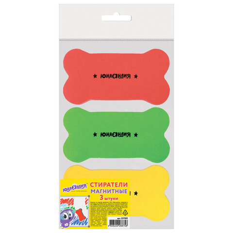 Стиратели магнитные для магнитно-маркерной доски ЮНЛАНДИЯ "Косточка", 55х110 мм, КОМПЛЕКТ 3 ШТ., ассорти, 237503