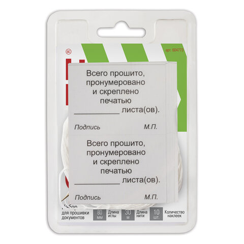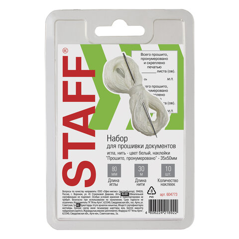 Набор для прошивки документов (игла 80 мм, нить 30 м, наклейки "Прошито, пронумеровано" 10 шт.), STAFF, 604773