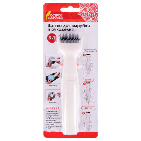 Щетка для вырубки и рукоделия "3 в 1" ОСТРОВ СОКРОВИЩ - это многофункциональный инструмент, включающий в себя щетку, лопатку и шило. Предназначен для удобства работы в скрапбукинге и других видах творчества.