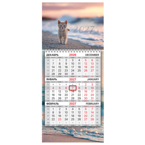 Календарь квартальный 2027 г., 1 блок, 1 гребень, бегунок, МИНИ, офсет, BRAUBERG, "Котенок", 118361