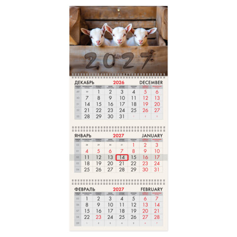 Календарь квартальный 2027г, 3 блока 3 гребня, бегунок, офсет, BRAUBERG, "Козлята", 118250