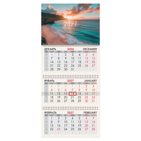 Календарь квартальный 2027г, 3 блока 3 гребня, бегунок, офсет, BRAUBERG, "Море", 118267
