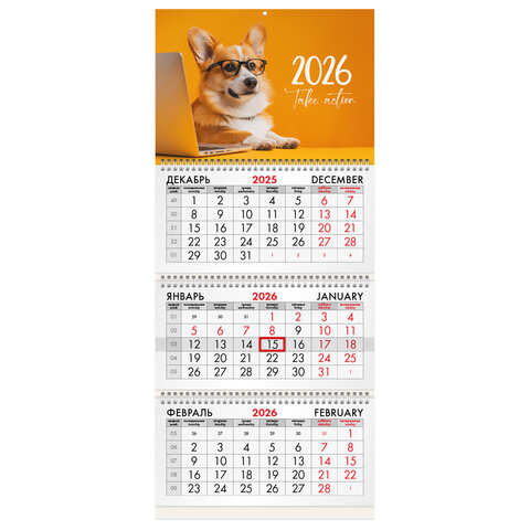 Календарь квартальный на 2026 г., 3 блока, 3 гребня, бегунок, мелованная бумага, BRAUBERG, "Умный корги", 116803
