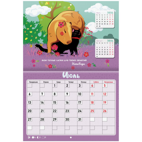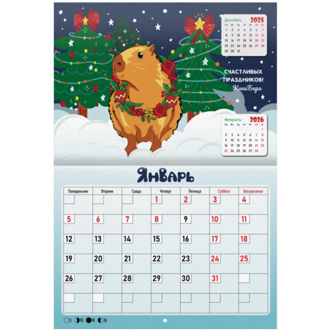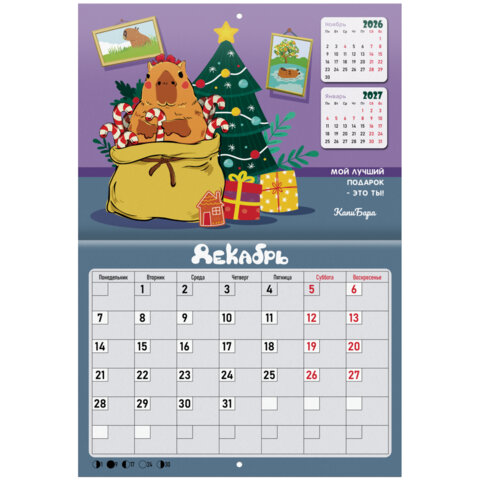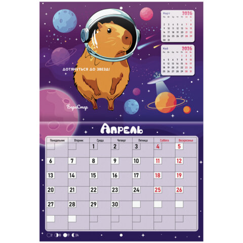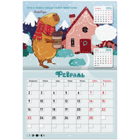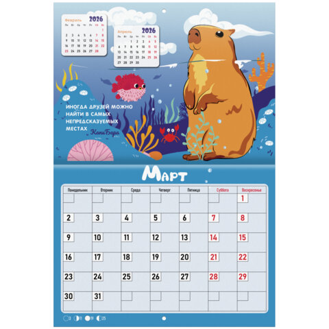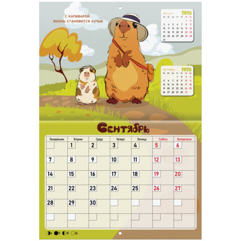Календарь-планер настенный перекидной на 2026 г., BRAUBERG, 12 листов, 29,5х21,3 см, "Капибара", 116953