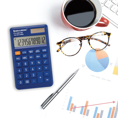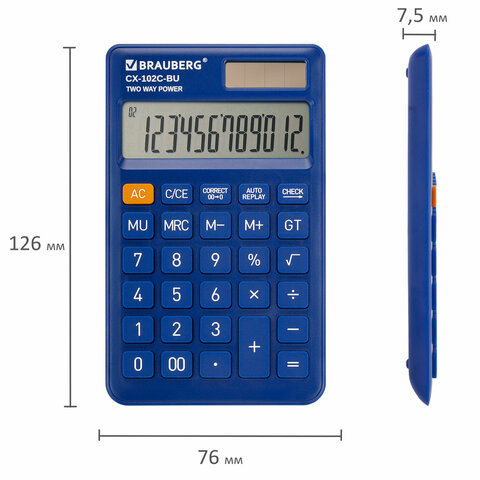 Калькулятор карманный BRAUBERG CX-102C-BU (76x126 мм), 12 разрядов, двойное питание, СИНИЙ, 272648