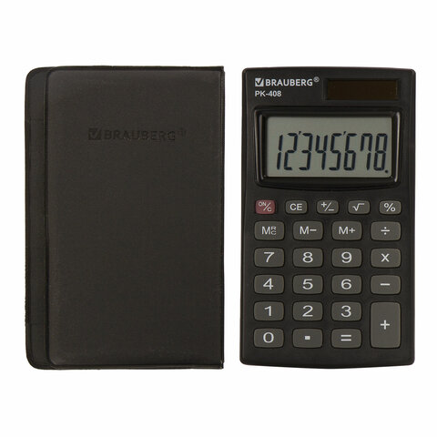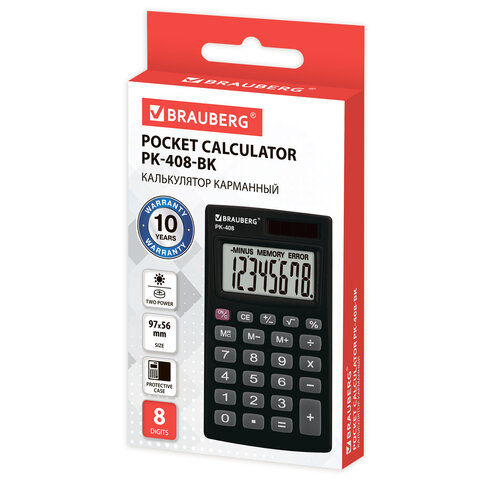 Калькулятор карманный BRAUBERG PK-408-BK (97x56 мм), 8 разрядов, двойное питание, ЧЕРНЫЙ, 250517