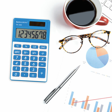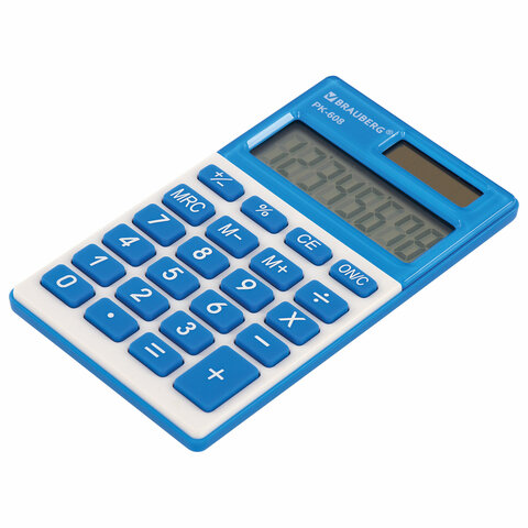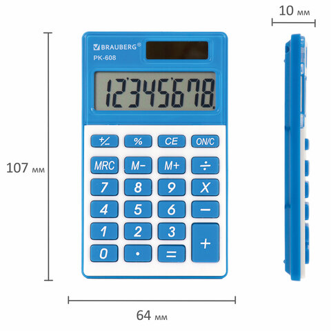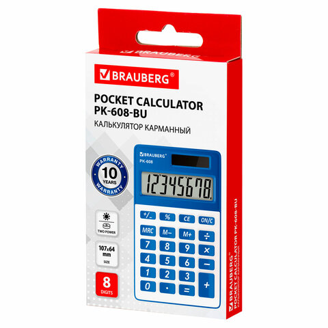 Калькулятор карманный BRAUBERG PK-608-BU (107x64 мм), 8 разрядов, двойное питание, СИНИЙ, 250519