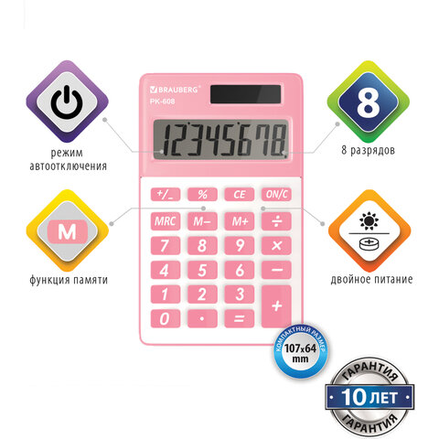 Калькулятор карманный BRAUBERG PK-608-PK (107x64 мм), 8 разрядов, двойное питание, РОЗОВЫЙ, 250523