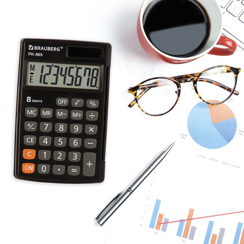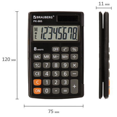 Калькулятор карманный BRAUBERG PK-865-BK (120x75 мм), 8 разрядов, двойное питание, ЧЕРНЫЙ, 250524