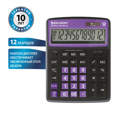 Калькулятор настольный BRAUBERG EXTRA COLOR-12-BKPR (206x155 мм),12 разрядов, двойное питание, ЧЕРНО-ФИОЛЕТОВЫЙ, 250480