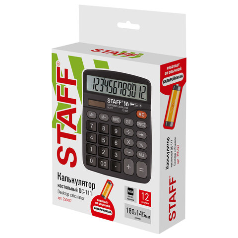 Калькулятор настольный STAFF PLUS DC-111 (180x145 мм), 12 разрядов, двойное питание, +БАТАРЕЙКА АА, 250427