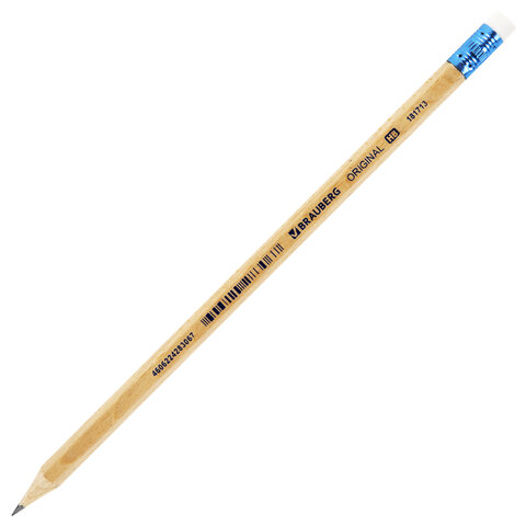 Карандаш чернографитный BRAUBERG "ORIGINAL", 1 шт., HB, с ластиком, некрашеный корпус, 181713