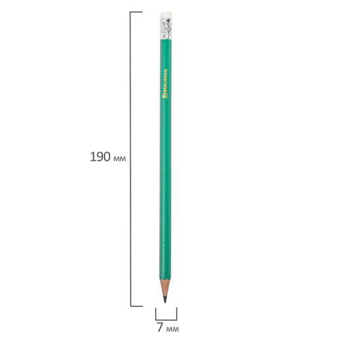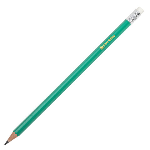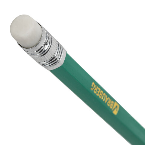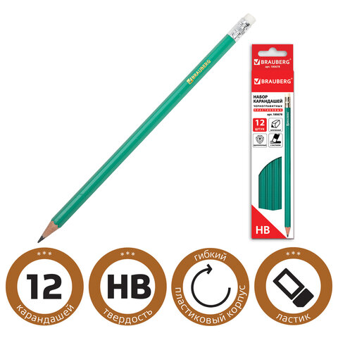 Карандаши чернографитные BRAUBERG НАБОР 12 шт., НВ, с резинкой, пластиковый зеленый корпус, 180678