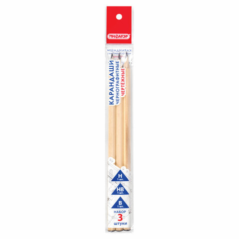 Карандаши чернографитные чертежные школьные разной твердости, НАБОР 3 штуки: Н, НВ, B, ПИФАГОР, 181998