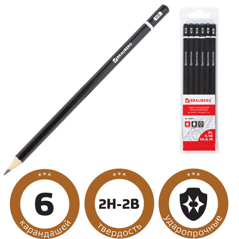 Карандаши чернографитные разной твердости НАБОР 6 штук, 2H-2B, BRAUBERG "Line", 180650
