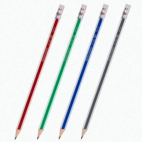 Набор карандашей чернографитных BRAUBERG "G-100" 4 шт., HB, с ластиком, корпус ассорти, 181715