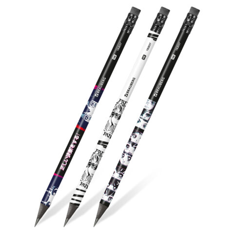 Набор карандашей чернографитных с принтом BRAUBERG "MANGA", 12 штук, HB, с ластиком, корпус ассорти, 182037