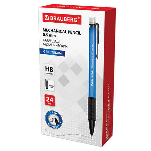 Карандаш механический 0,5 мм, BRAUBERG "Comfort", ластик, резиновый грип, корпус синий, 180283