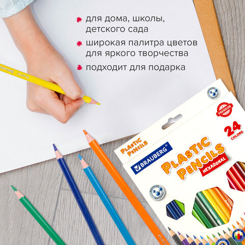 Карандаши цветные BRAUBERG PREMIUM, 24 цвета, шестигранные, грифель 3 мм, 181668