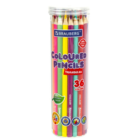 Карандаши цветные BRAUBERG PREMIUM 36 цветов в тубе, трехгранные, грифель 3,3 мм, натуральное дерево, 181934