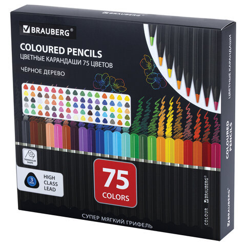 Карандаши цветные чёрное дерево BRAUBERG BLACK WOOD, 75 цветов, мягкий грифель 3 мм, 182044