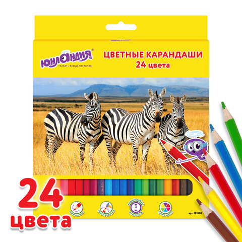 Карандаши цветные ЮНЛАНДИЯ "МИР ЖИВОТНЫХ", 24 цвета, шестигранные, грифель 3 мм, натуральное дерево, 181385