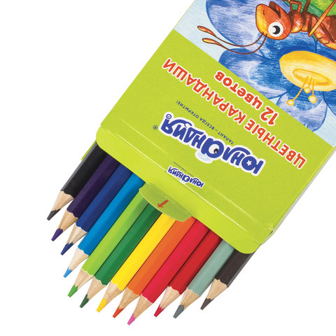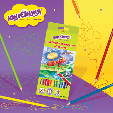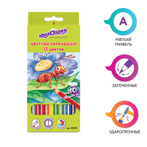Карандаши цветные ЮНЛАНДИЯ "В ГОСТЯХ У БУКАШЕК", 12 цветов, шестигранные, грифель 3 мм, натуральное дерево, 181378